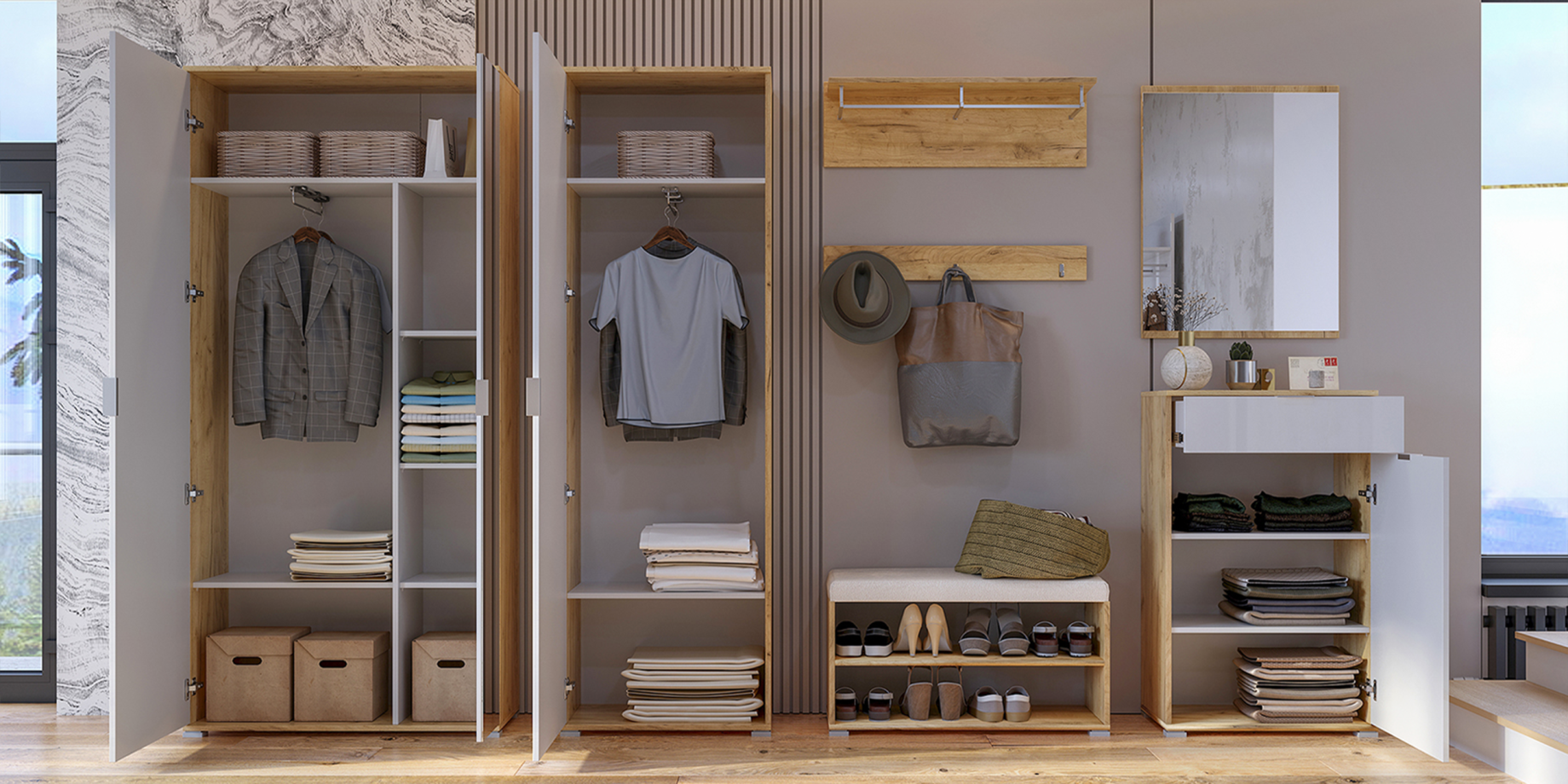 У шафах встановлений посилений вішак — надійний і довговічний механізм для зберігання верхнього одягу. Завдяки посиленій конструкції він витримує більші навантаження, зберігаючи плавність ходу та зручність у користуванні. Це ідеальне рішення для щоденного використання, яке поєднує функціональність і практичність.