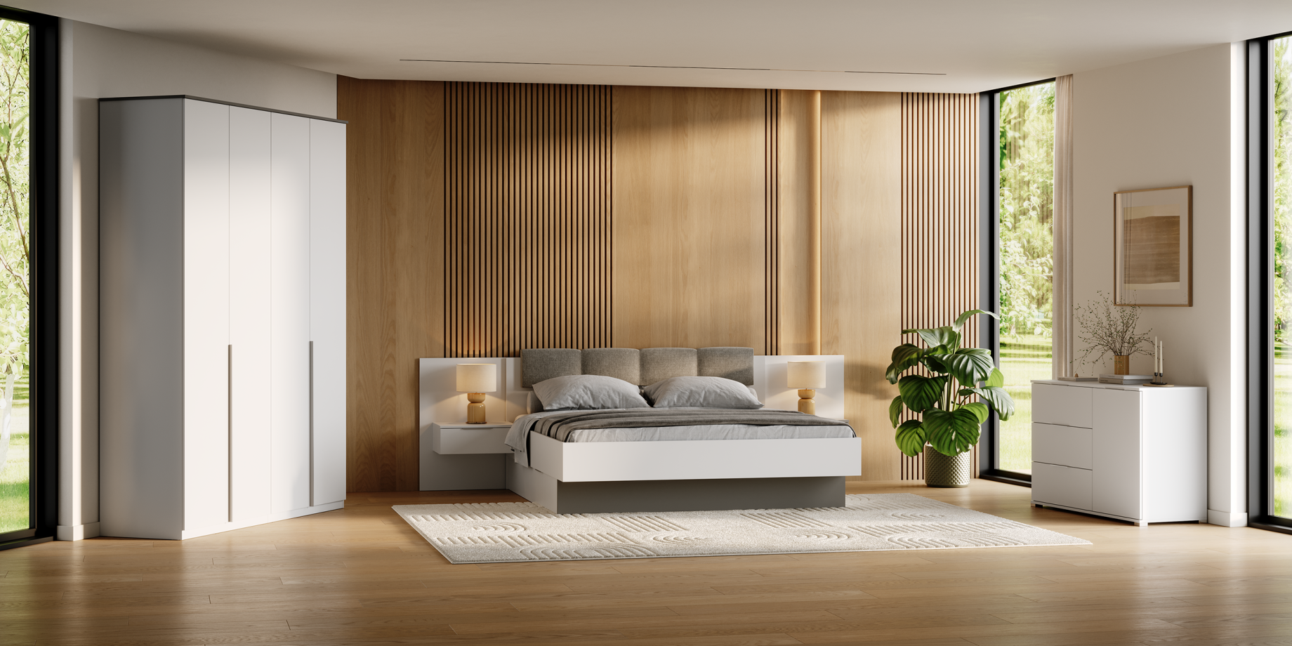 Важливими акцентами колекції є вставки з плити кольору Шиншила Сіра , які прикрашають ліжко та карнизи шаф, надаючи їм виразної індивідуальності. Довгі профільні ручки на шафах підкреслюють сучасний вигляд і функціональність. Ліжко, оснащене стильним підсвічуванням, має стандартну сіру м’яку вставку, яку можна замінити на одну з багатьох тканин з нашої колекції на вибір, щоб ідеально відповідати вашому інтер’єру.
