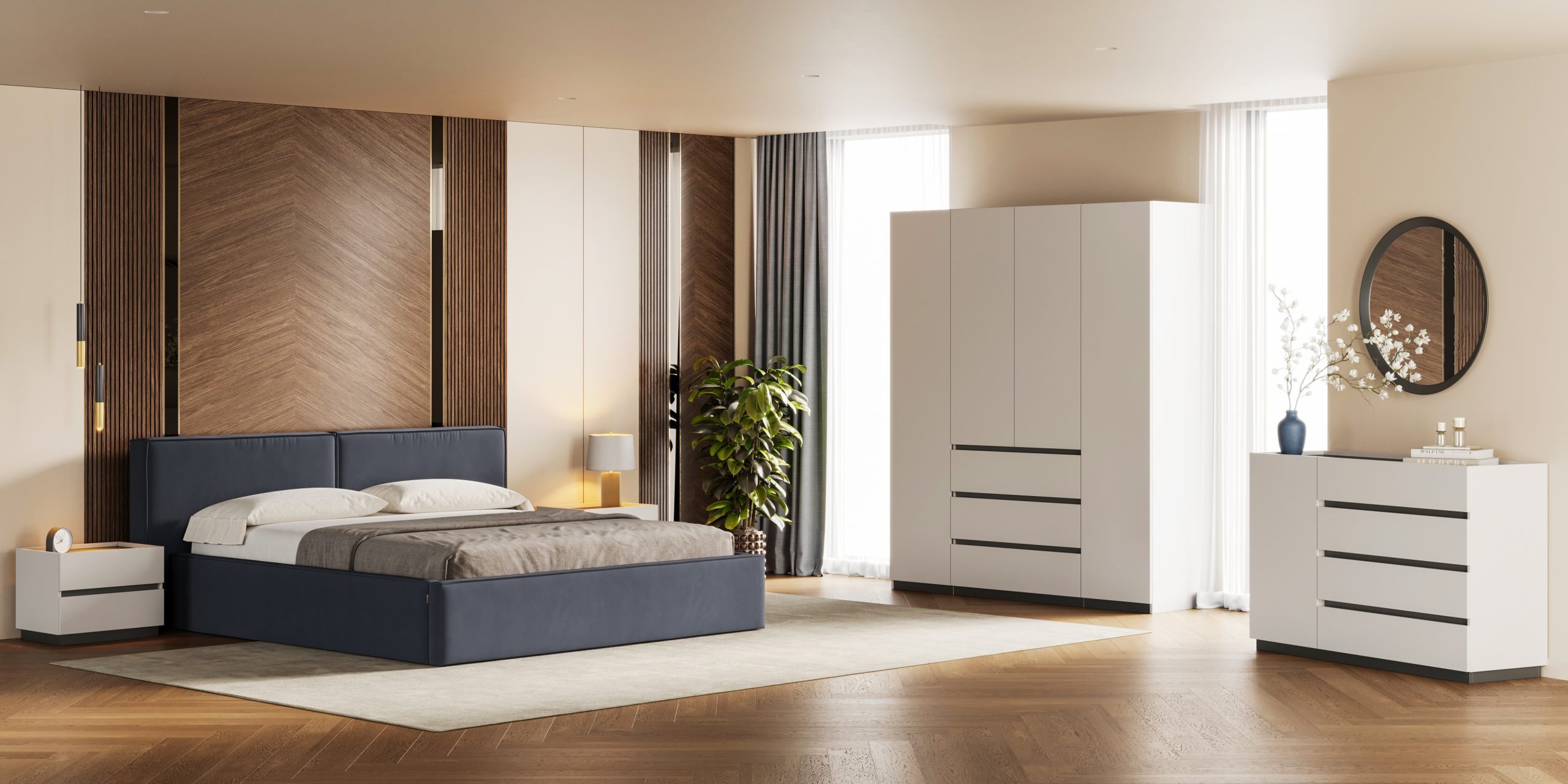 Представляємо колекцію спальні від меблевого виробника «МироМарк», яка поєднує в собі сучасний мінімалізм і глибоку естетику контрастів. Білий суперматовий фасад гармонійно поєднується з деталями у антрацитовому глянці, створюючи образ елегантної, стриманої вишуканості.
