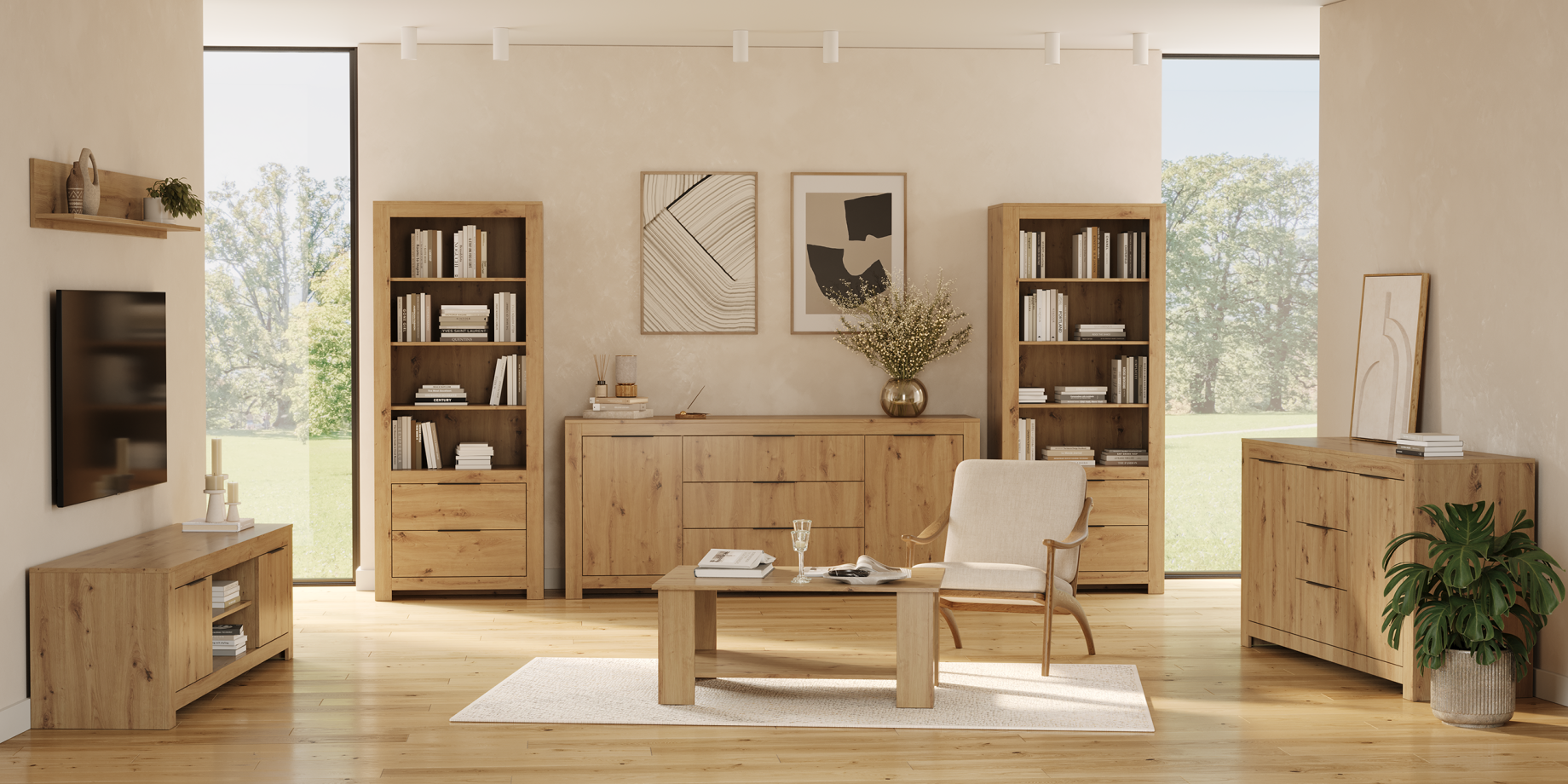 До комплекту входить: Тумба ТВ, комод 1.6 м та 2.0 м, пенал з двома шухлядами та відкритими полицями, полиця настінна, компактний журнальний стіл. Вітальня з фактурою “Дуб Артізан” — це ідеальний вибір для тих, хто цінує якість, естетику та вишуканість.