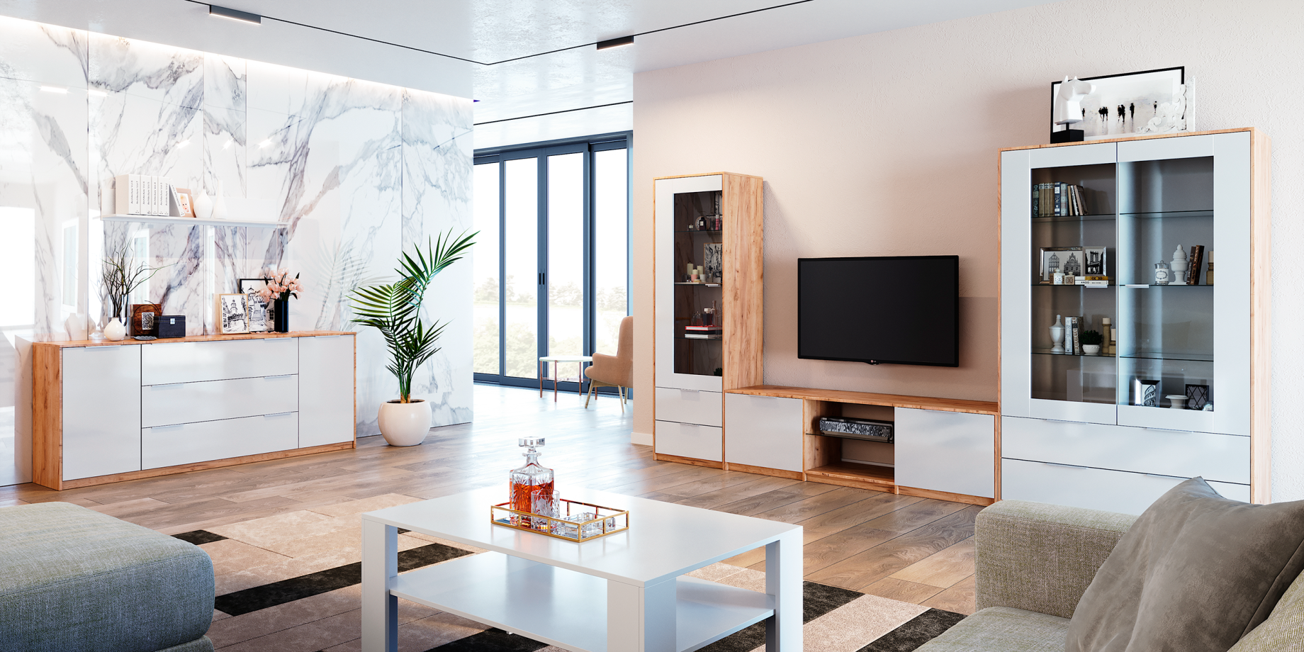 The nice thing is that, if necessary, furniture from the living room collection can be combined with elements of the Asti bedroom. In addition, this version of the living room is distinguished by an affordable price, but the quality, like all the manufacturer’s furniture, is at its best.