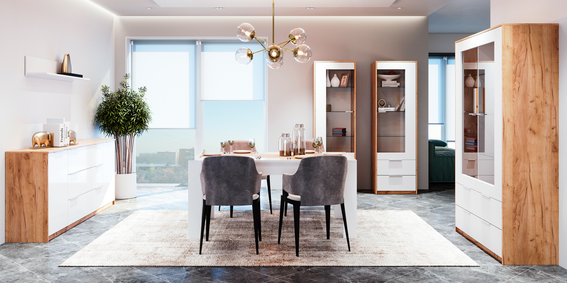The multi-layer high-gloss lacquer coating, cured using ultraviolet (UV) light, demonstrates increased resistance to wear and light exposure. Thanks to its stable pigment structure and advanced polishing technology, the finish retains its deep color and mirror-like shine over time, without noticeable shade changes even under long-term use. The high-gloss surface visually expands the space and highlights the contemporary character of the interior.