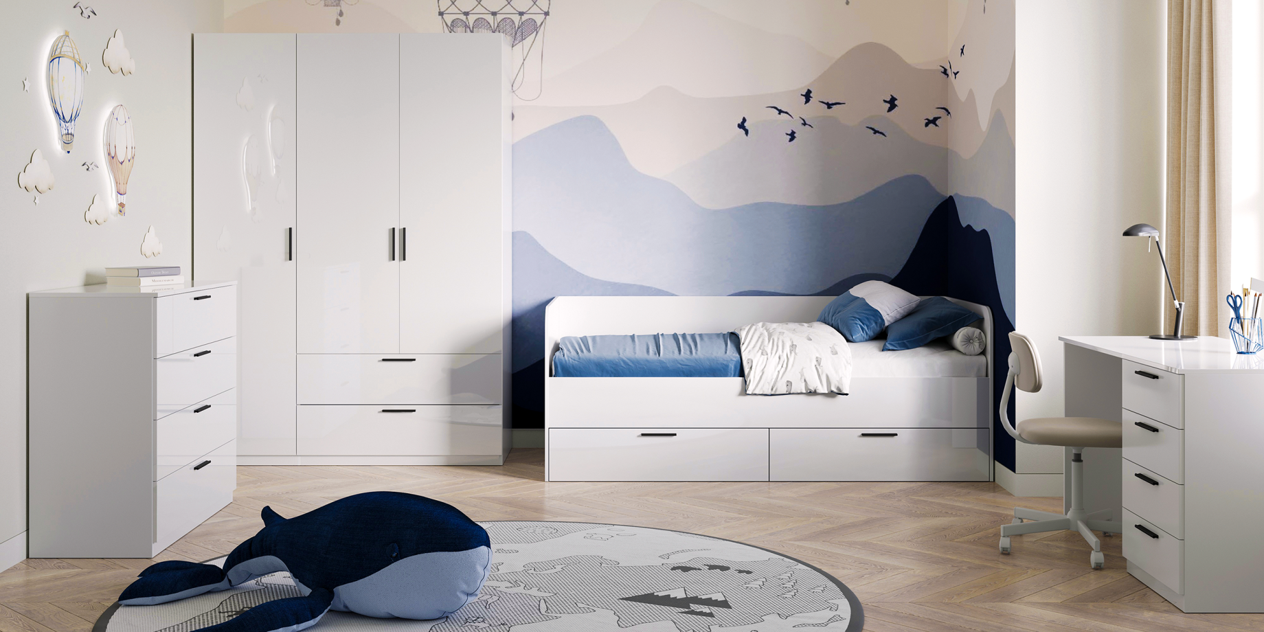 The Happy collection also includes several options with spacious wardrobes of different sizes. Also it includes a chest of drawers and a desk with four drawers. This whole set of furniture will allow you to zone properly the interior of the room and use the bedroom functionally.