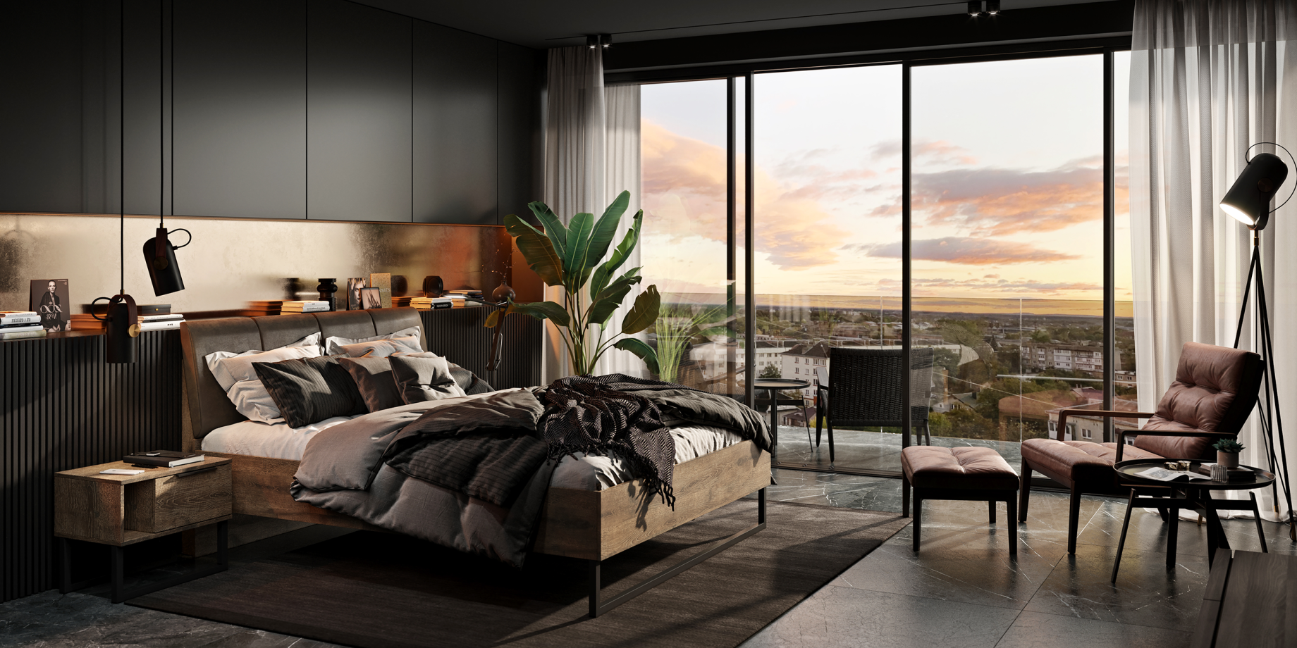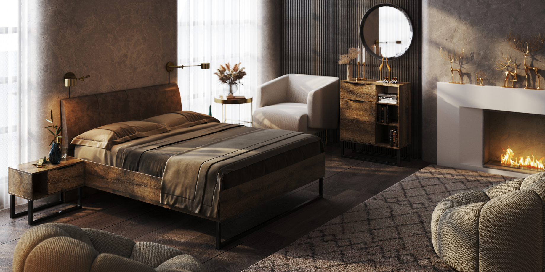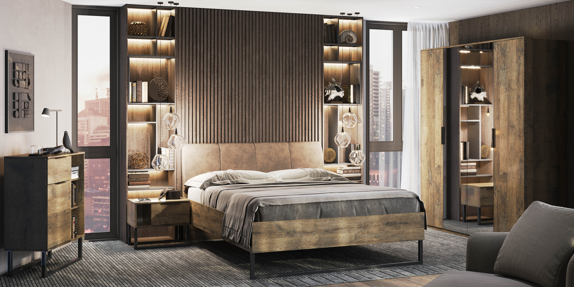 Quadro is the first loft-style bedroom with a frigate oak. The dark shade of wood conveys all the uniqueness of this style: originality, minimalism, freedom of space.