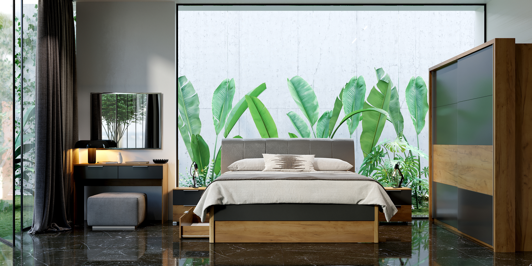 Ramona is a collection distinguished by the more massive bed design with built-in drawers and unique wardrobe fronts. It also stands out thanks to its exclusive color scheme: Craft Oak as the matte base and “Earth” — a deep, glossy tone used for the fronts and decorative inserts.